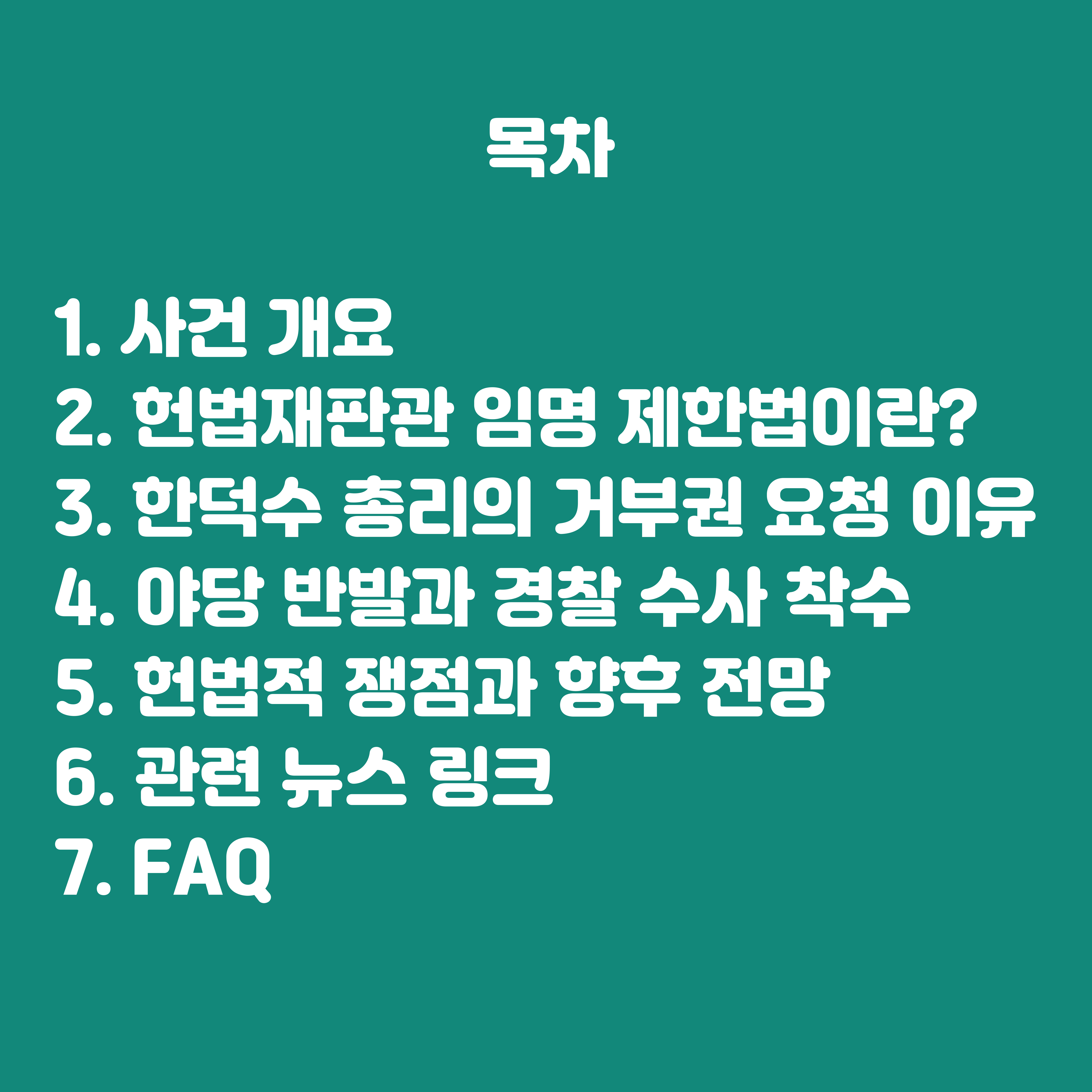 한덕수 국무총리가 헌법재판관 임명 제한법에 대해 대통령에게 거부권을 요청하며 정치권이 술렁이고 있습니다. 여야 간 충돌은 물론, 경찰의 직권남용 수사까지 번지며 정국이 크게 흔들리는 모습입니다. 이번 사건의 핵심과 의미, 앞으로의 흐름을 정리해드립니다. 📰